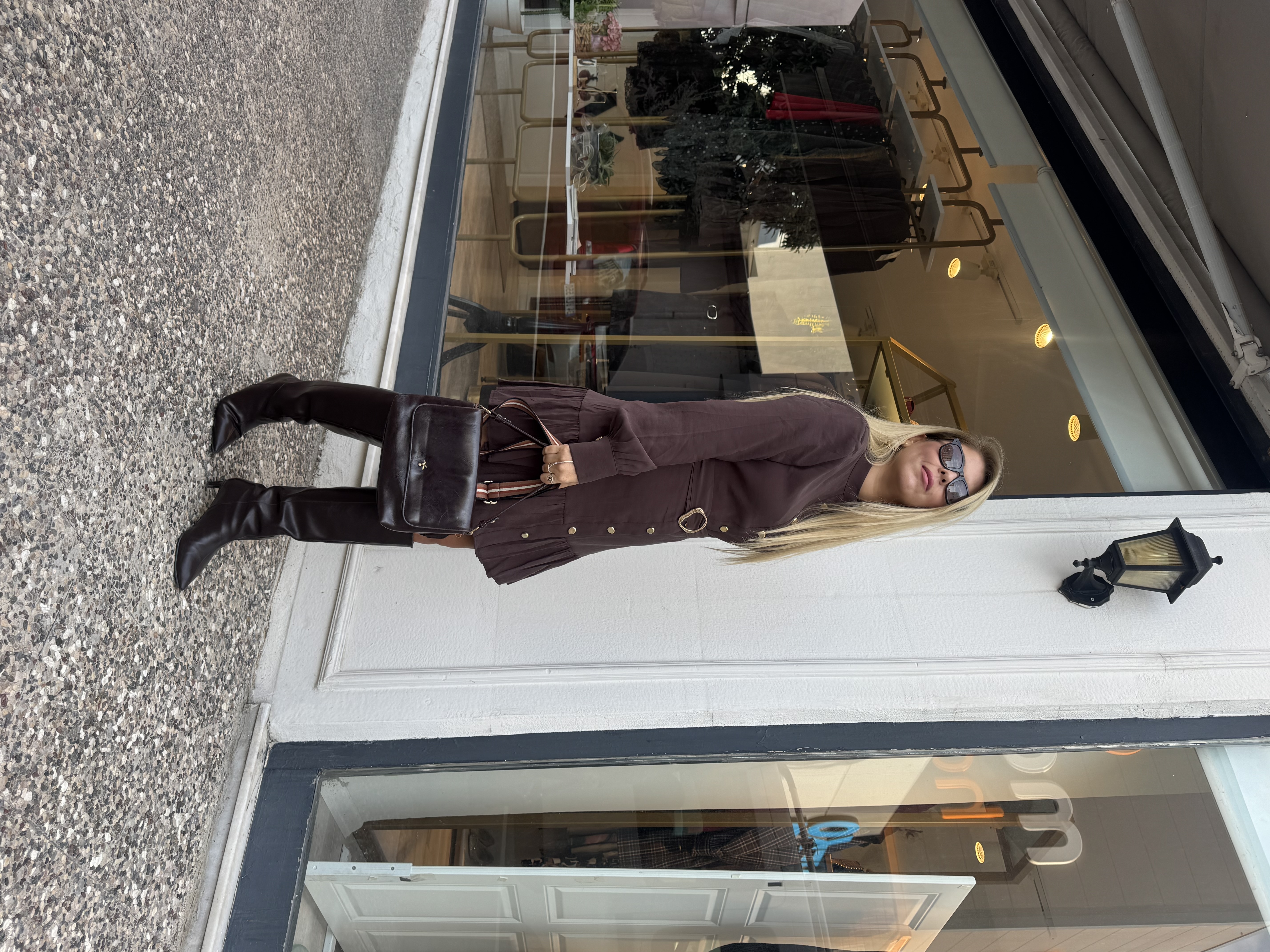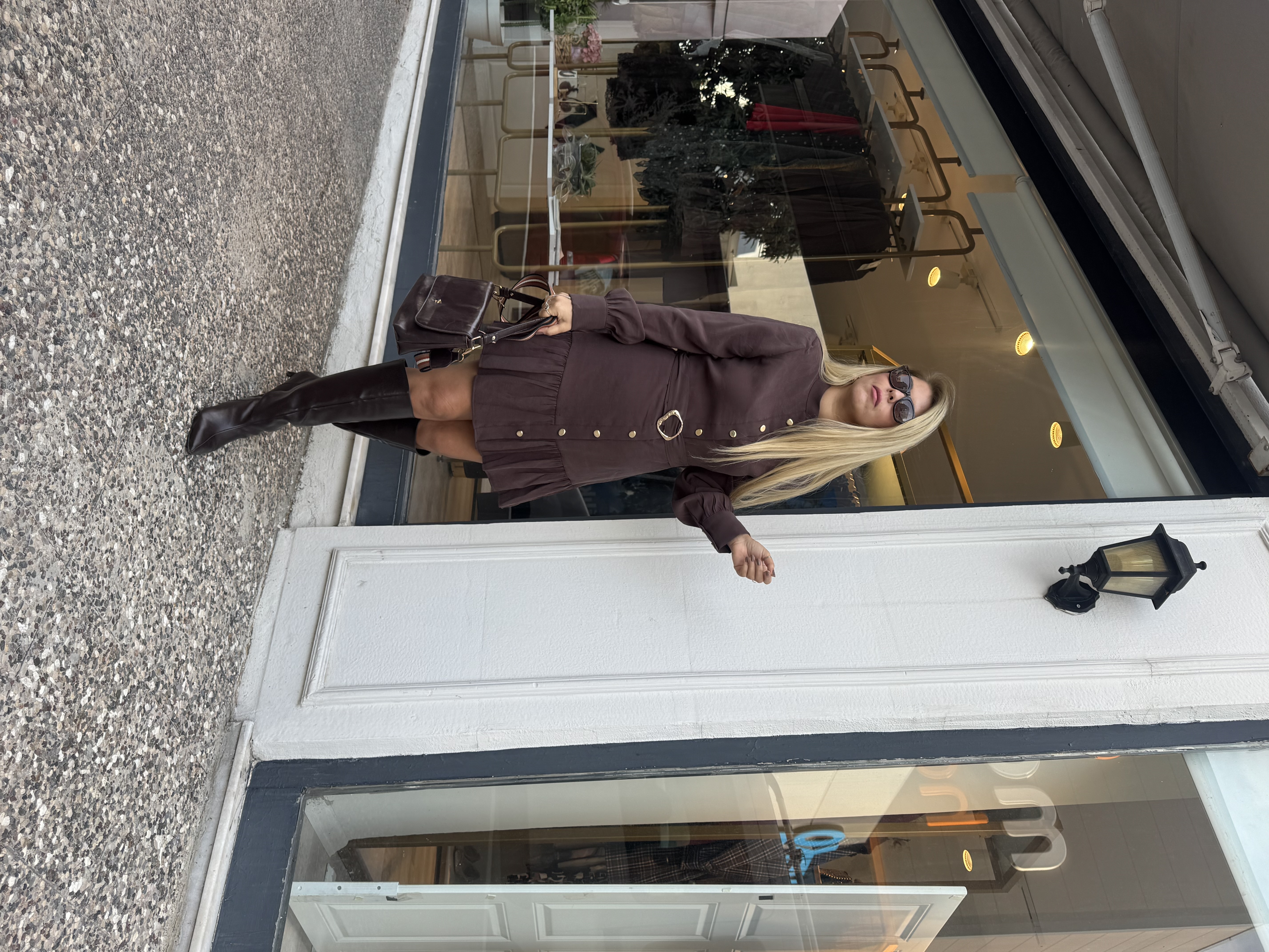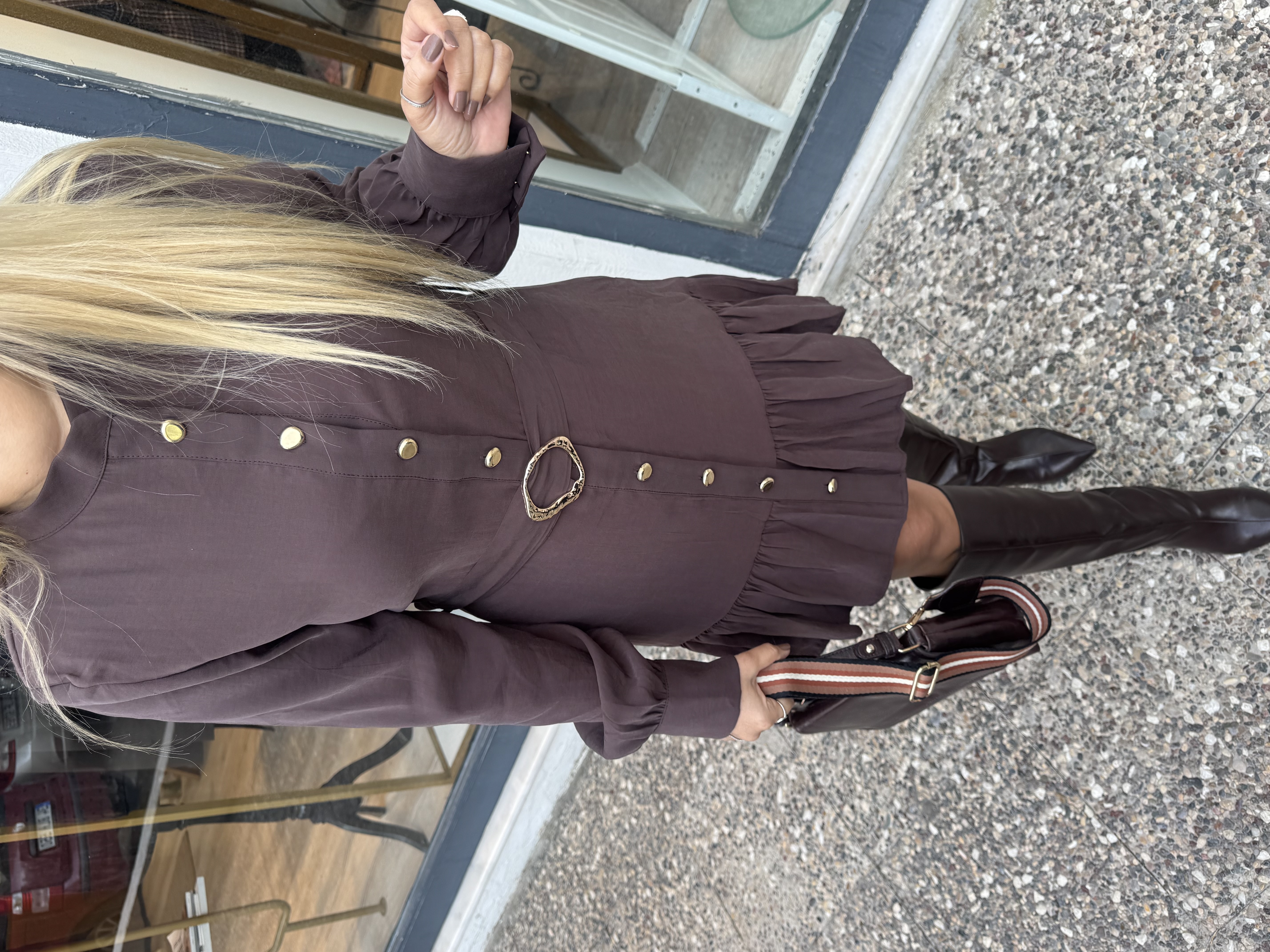KAHVE ÖNDEN DÜĞMELİ TENCEL ELBİSE