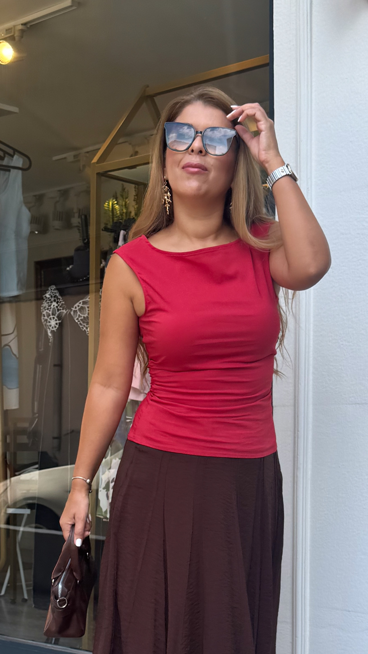 KIRMIZI KAYIK YAKA BÜZGÜLÜ BLUZ