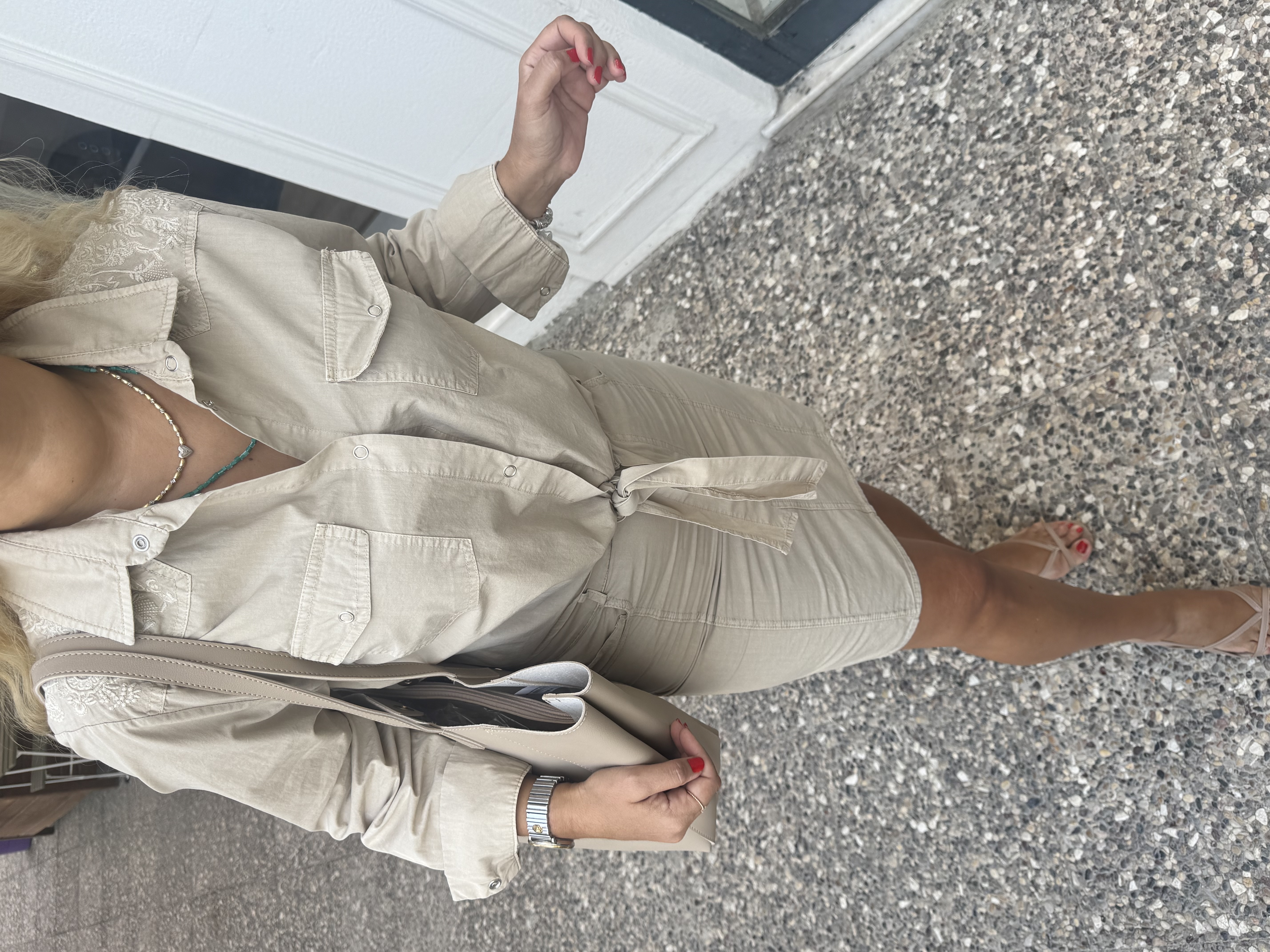 BEJ İŞLEMELİ BELDEN BAĞLAMALI GÖMLEK